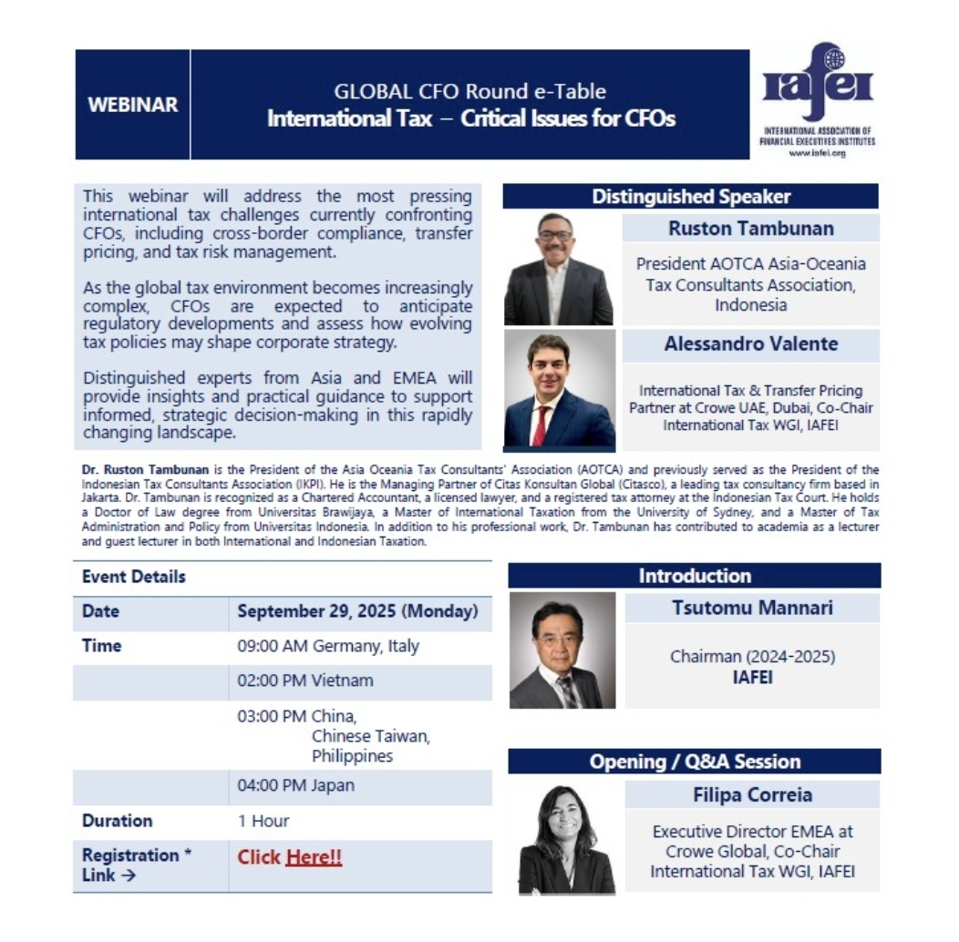 On September 29, 2025, Dr. Ruston Tambunan, the President of the Asia Oceania Tax Consultants' Association (AOTCA), had the honor of being one of the distinguished speakers at the Global CFO e-Roundtable hosted by the International Association of Financial Executives Institutes (IAFEI). IAFEI serves as an observer to the Global Tax Advisers Forum (GTAP), where AOTCA is one of the founding members alongside CFE and WAUTI. This roundtable brought together global leaders and senior financial executives to discuss critical issues in international taxation that directly affect Chief Financial Officers (CFOs).
